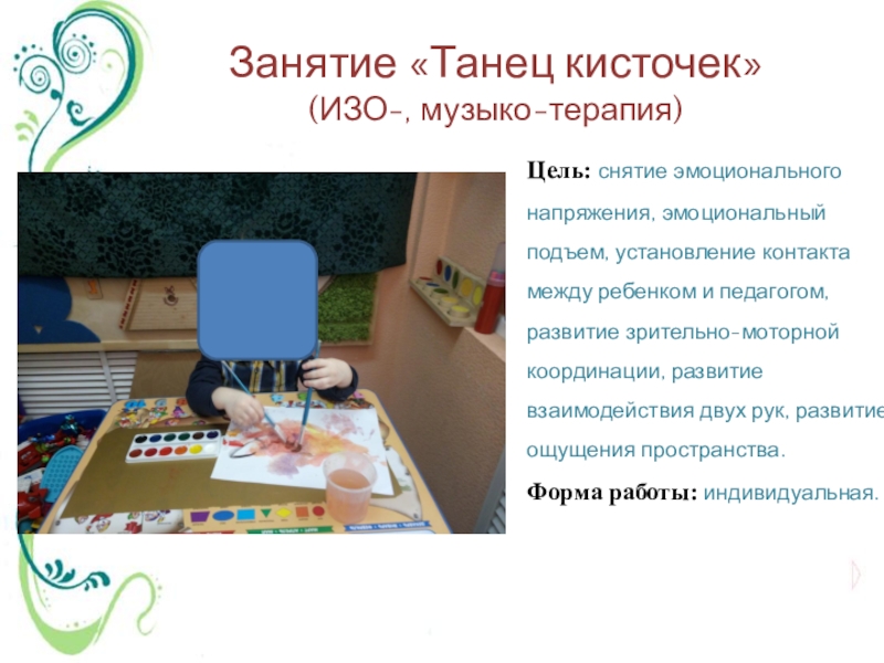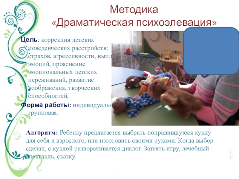 Алгоритм: Ребенку предлагается выбрать понравившуюся куклу для себя и взрослого, или изготовить своими руками. Когда выбор сделан, с куклой разворачивается диалог. Затеять игру, лечебный спектакль, сказку.