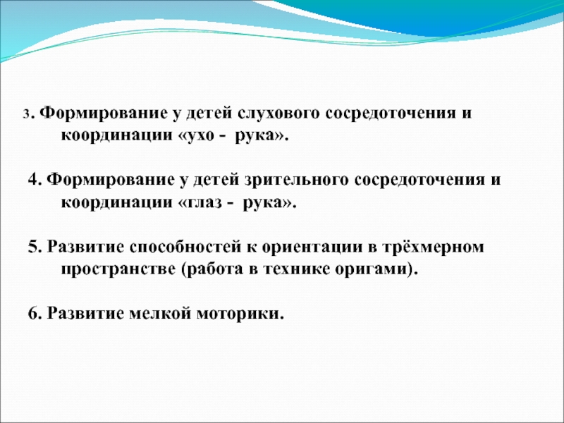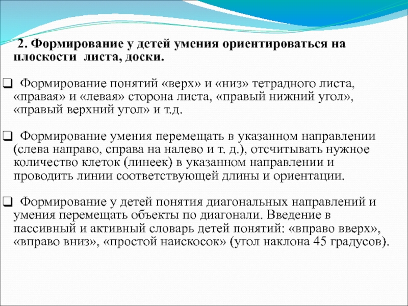 Слайд 6 2. Формирование у детей умения ориентироваться на плоскости листа, доски.