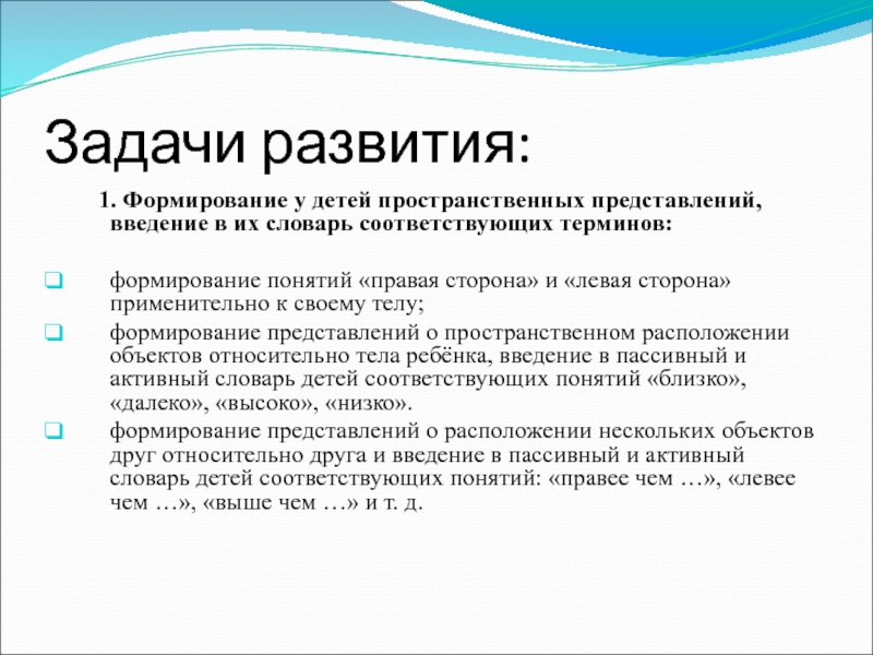 формирование представлений о пространственном расположении объектов относительно тела ребёнка, введение в пассивный и активный словарь детей соответствующих понятий «близко», «далеко», «высоко», «низко».