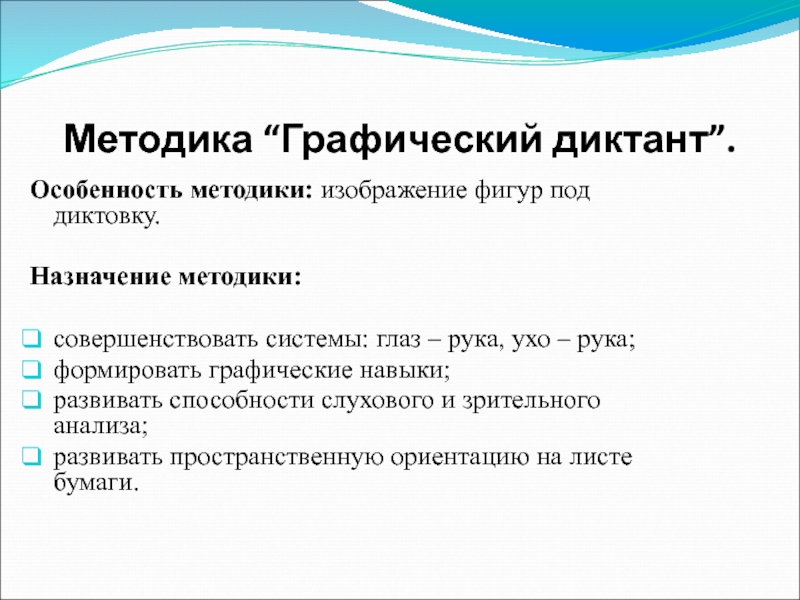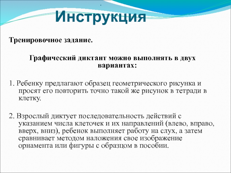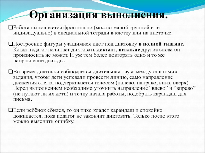 Во время диктовки соблюдается длительная пауза между «шагами» задания, чтобы дети успевали провести линию, само направление движения слегка подчеркивается голосом (налево, направо, вниз, вверх). Перед выполнением необходимо уточнить направление “влево” и “вправо” (не путают ли их дети) и точку начала работы, подобрать карандаш для письма.