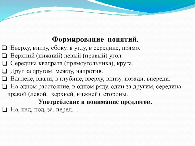 Вверху, внизу, сбоку, в углу, в середине, прямо.