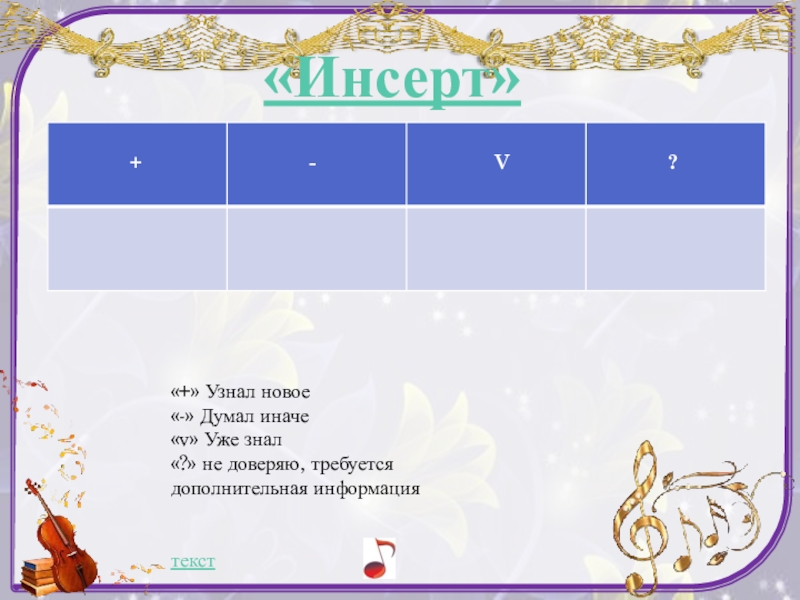 «Инсерт»«+» Узнал новое «-» Думал иначе«v» Уже знал«?» не доверяю, требуется дополнительная информациятекст