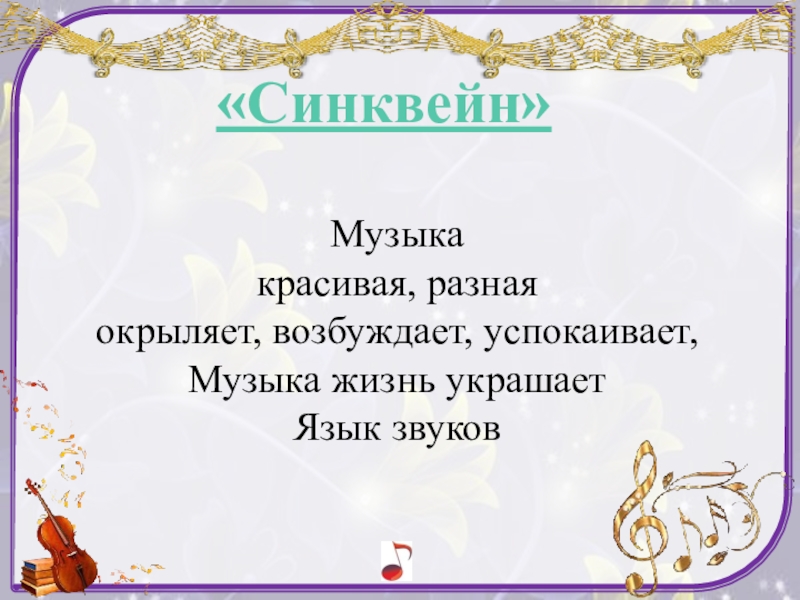 Музыка  красивая, разная  окрыляет, возбуждает, успокаивает,  Музыка жизнь украшает  Язык звуков«Синквейн»