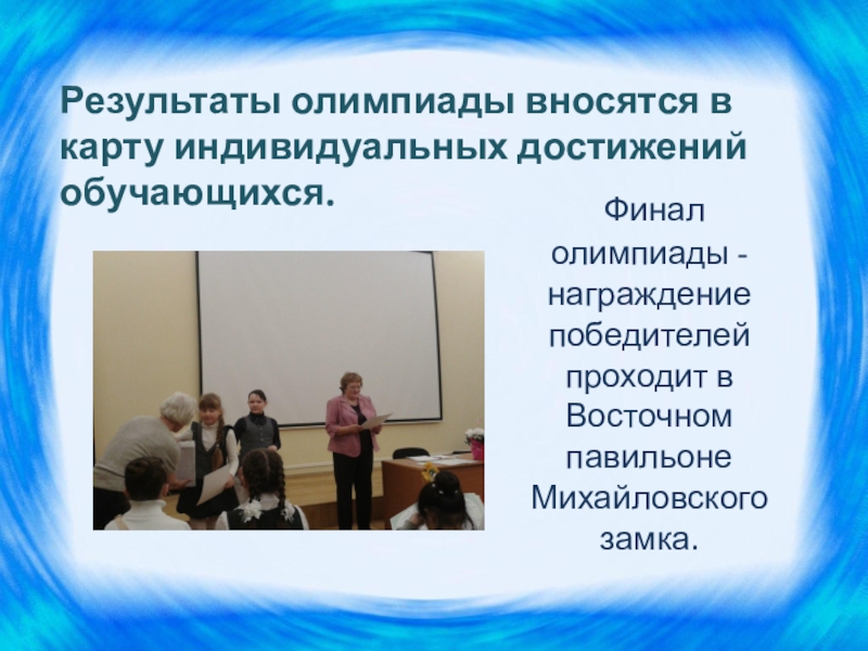 Результаты олимпиады вносятся в карту индивидуальных достижений обучающихся.