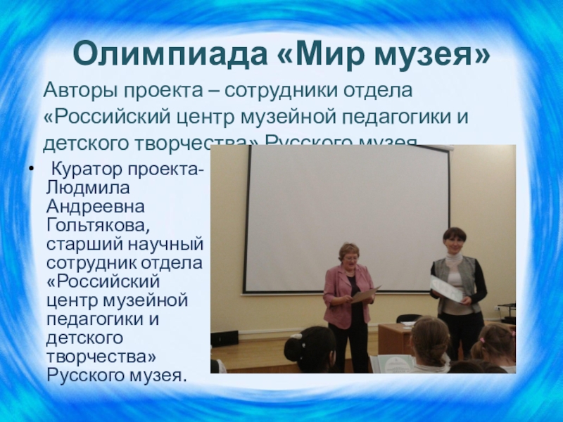 Куратор проекта-Людмила Андреевна Гольтякова, старший научный сотрудник отдела «Российский центр музейной педагогики и детского творчества» Русского музея.