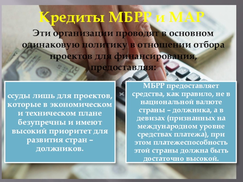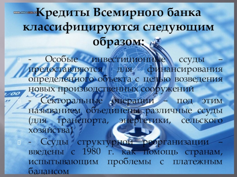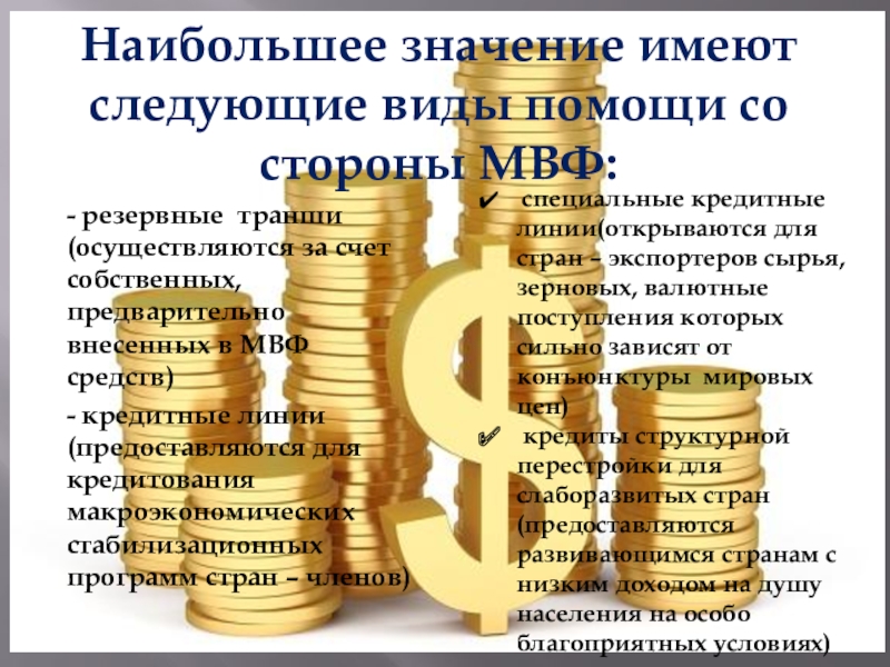 специальные кредитные линии(открываются для стран – экспортеров сырья, зерновых, валютные поступления которых сильно зависят от конъюнктуры мировых цен)