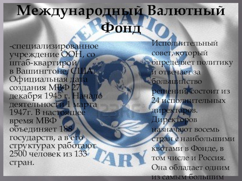 Исполнительный совет, который определяет политику и отвечает за большинство решений, состоит из 24 исполнительных директоров. Директоров назначают восемь стран с наибольшими квотами в Фонде, в том числе и Россия. Она обладает одним из самым большим количеством голосов в МВФ – 2,74%