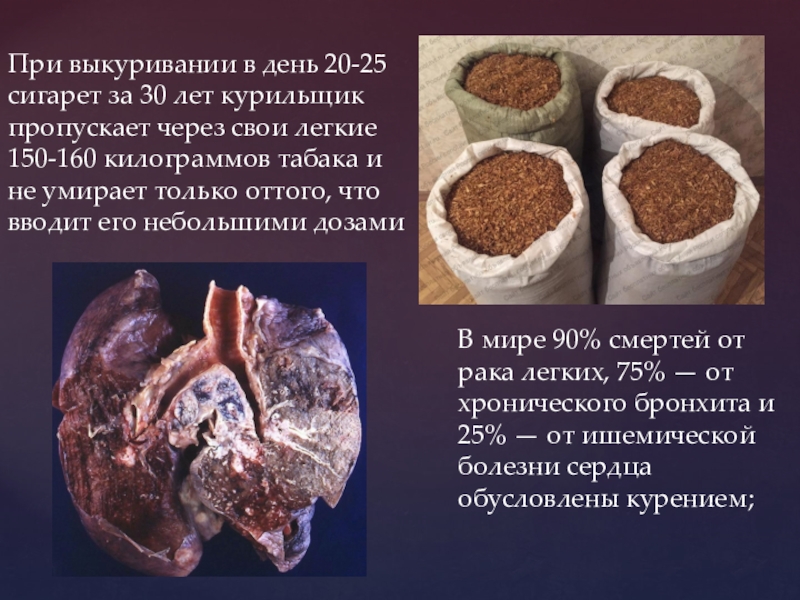 В мире 90% смертей от рака легких, 75% — от хронического бронхита и 25% — от ишемической болезни сердца обусловлены курением;