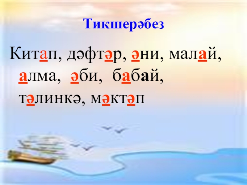 ТикшерәбезКитап, дәфтәр, әни, малай, алма, әби, бабай, тәлинкә, мәктәп