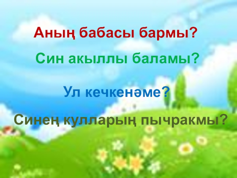 Аның бабасы бармы?Син акыллы баламы?Ул кечкенәме?Синең кулларың пычракмы?