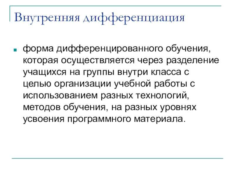 Внутренняя дифференциацияформа дифференцированного обучения, которая осуществляется через разделение учащихся на группы внутри класса с целью организации учебной работы