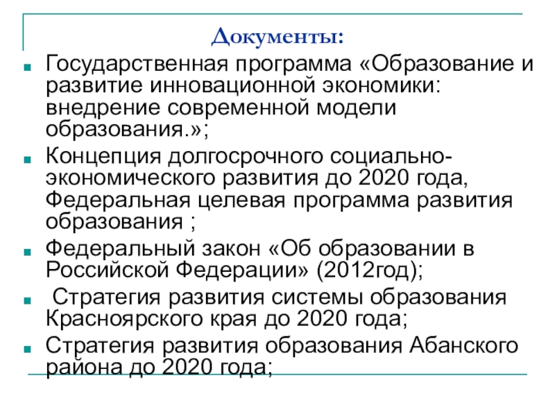 Документы: Государственная программа «Образование и развитие инновационной экономики: внедрение современной модели образования.»;Концепция долгосрочного социально-экономического развития до 2020 года, Федеральная целевая программа развития образования ; Федеральный закон «Об образовании в Российской Федерации» (2012год); Стратегия развития системы образования