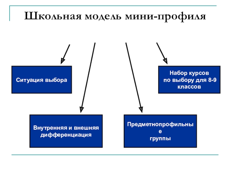 Школьная модель мини-профиляСитуация выбораВнутренняя и внешняядифференциацияПредметнопрофильные группыНабор курсов по выбору для 8-9 классов