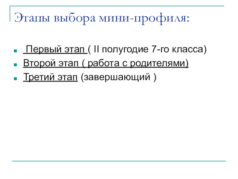 Этапы выбора мини-профиля: Первый этап ( II полугодие 7-го класса) Второй этап ( работа с родителями) Третий этап (завершающий
