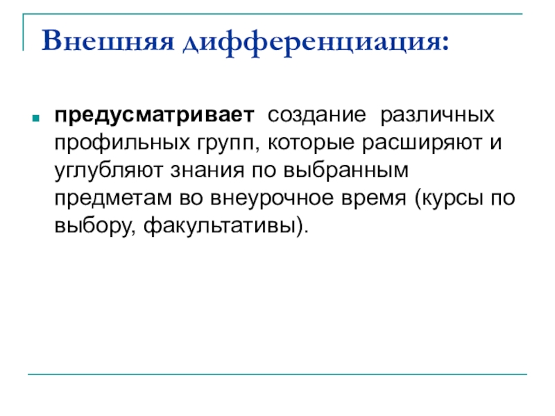 Внешняя дифференциация: предусматривает  создание различных профильных групп, которые расширяют и углубляют знания по выбранным предметам во внеурочное
