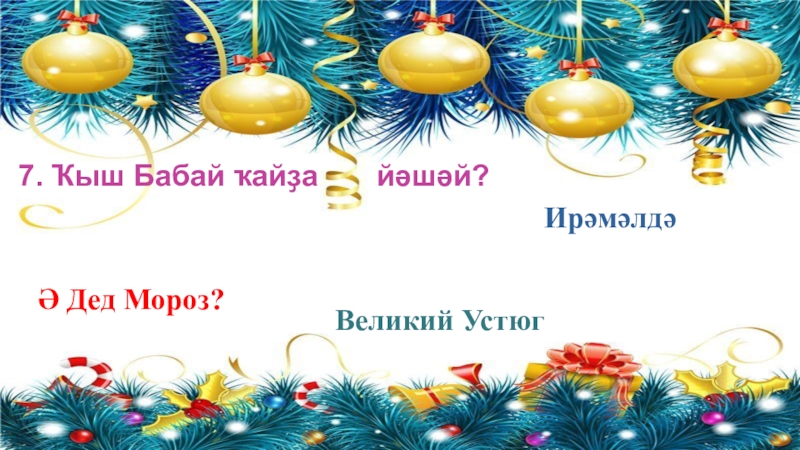 7. Ҡыш Бабай ҡайҙа    йәшәй?ИрәмәлдәӘ Дед Мороз?Великий Устюг