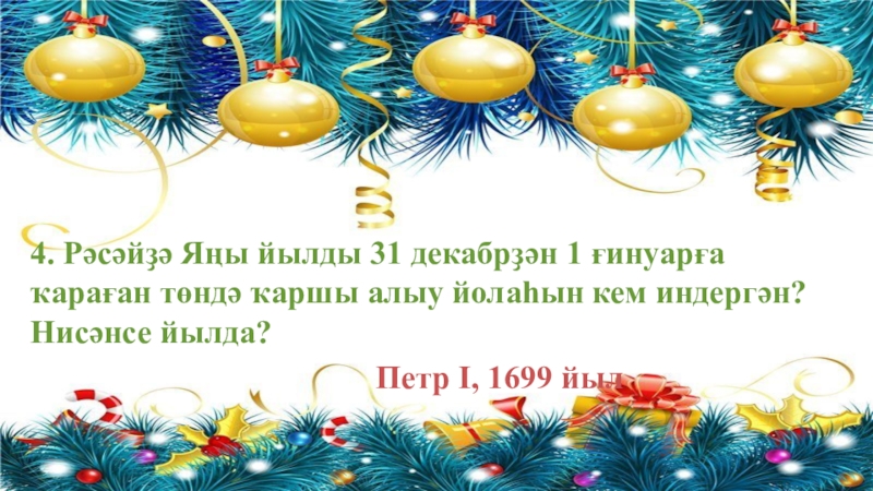 4. Рәсәйҙә Яңы йылды 31 декабрҙән 1 ғинуарға ҡараған төндә ҡаршы алыу йолаһын кем индергән? Нисәнсе йылда?Петр