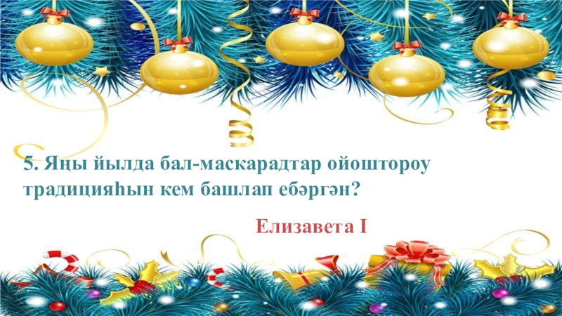 5. Яңы йылда бал-маскарадтар ойоштороу традицияһын кем башлап ебәргән?Елизавета I