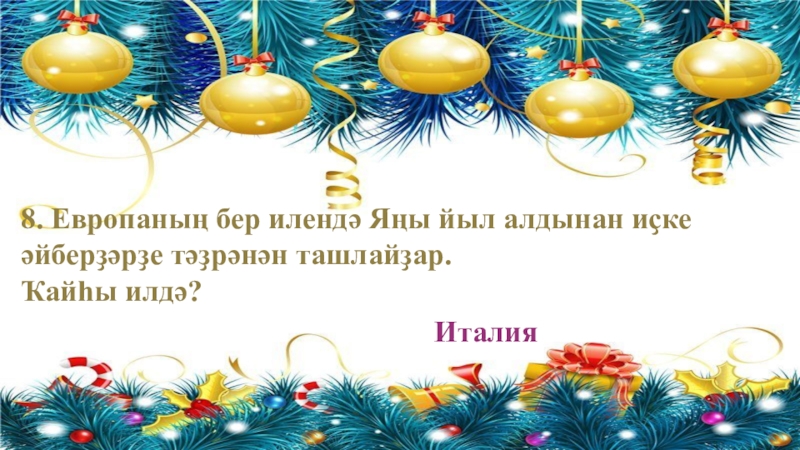8. Европаның бер илендә Яңы йыл алдынан иҫке әйберҙәрҙе тәҙрәнән ташлайҙар. Ҡайһы илдә? Италия