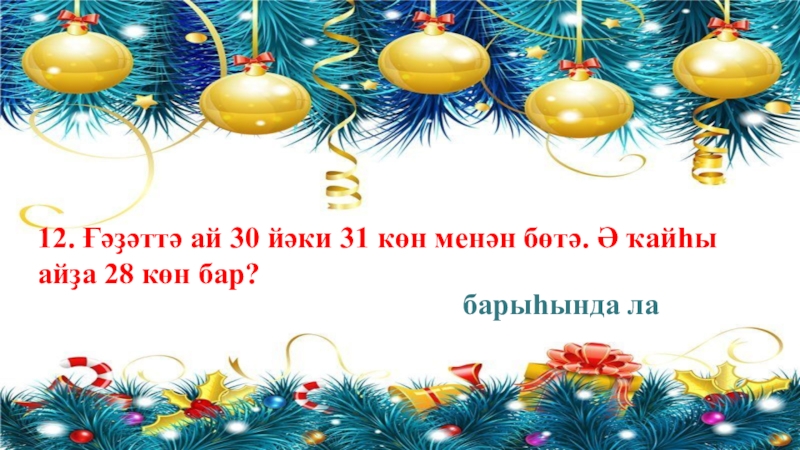 12. Ғәҙәттә ай 30 йәки 31 көн менән бөтә. Ә ҡайһы айҙа 28 көн бар?барыһында ла
