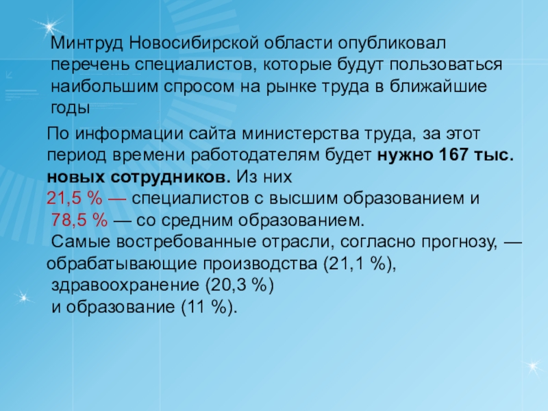 Самые востребованные отрасли, согласно прогнозу, — обрабатывающие производства (21,1 %),