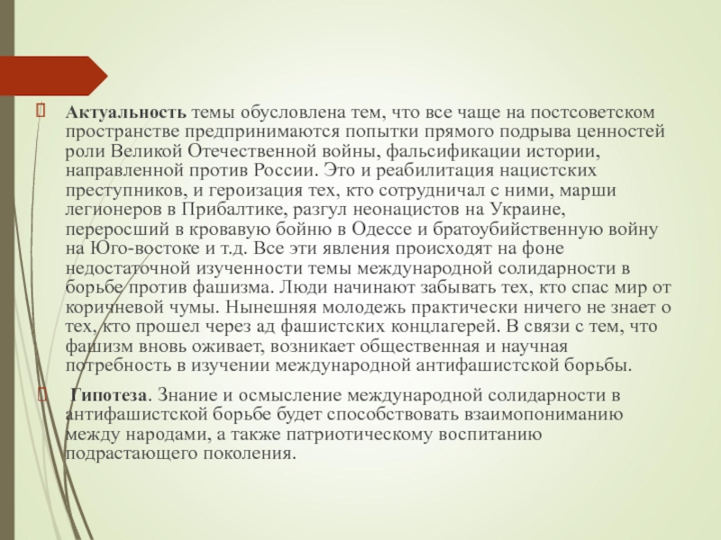 Гипотеза. Знание и осмысление международной солидарности в антифашистской борьбе будет способствовать взаимопониманию между народами, а также патриотическому воспитанию подрастающего поколения.
