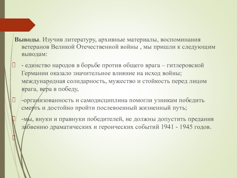 Выводы. Изучив литературу, архивные материалы, воспоминания ветеранов Великой Отечественной