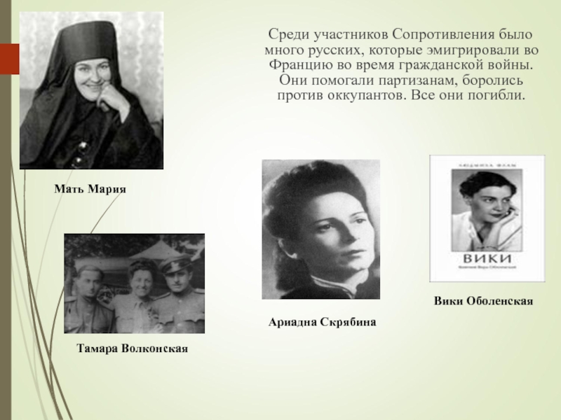 русских, которые эмигрировали во Францию во время гражданской войны. Они помогали партизанам, боролись против оккупантов. Все они погибли.