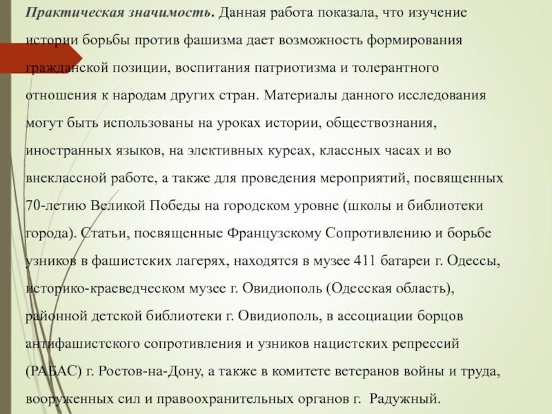 фашизма дает возможность формирования гражданской позиции, воспитания патриотизма и толерантного отношения к народам других стран. Материалы данного исследования могут быть использованы на уроках истории, обществознания, иностранных языков, на элективных курсах, классных часах и во внеклассной работе, а также для проведения мероприятий, посвященных 70-летию Великой Победы на городском уровне (школы и библиотеки города). Статьи, посвященные Французскому Сопротивлению и борьбе узников в фашистских лагерях, находятся в музее 411 батареи г. Одессы, историко-краеведческом музее г. Овидиополь (Одесская область), районной детской библиотеки г. Овидиополь, в ассоциации борцов антифашистского сопротивления и узников нацистских репрессий (РАБАС) г. Ростов-на-Дону, а также в комитете ветеранов войны и труда, вооруженных сил и правоохранительных органов г. Радужный.