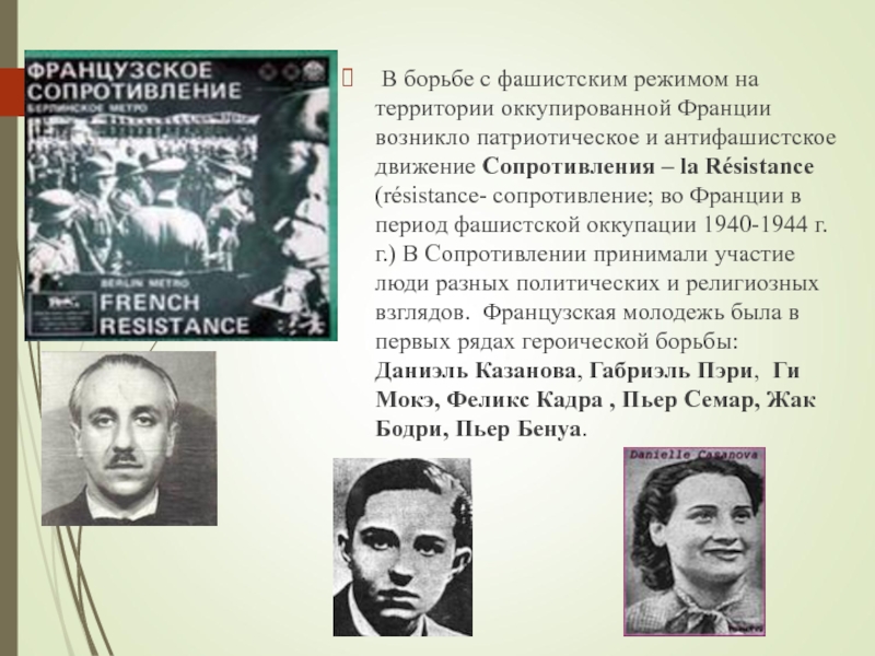 возникло патриотическое и антифашистское движение Сопротивления – la Résistance (résistance- сопротивление; во Франции в период фашистской оккупации 1940-1944 г.г.) В Сопротивлении принимали участие люди разных политических и религиозных взглядов. Французская молодежь была в первых рядах героической борьбы: Даниэль Казанова, Габриэль Пэри, Ги Мокэ, Феликс Кадра , Пьер Семар, Жак Бодри, Пьер Бенуа.