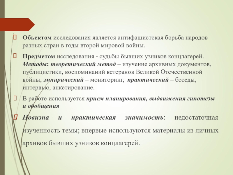 Предметом исследования - судьбы бывших узников концлагерей. Методы: теоретический метод – изучение архивных документов, публицистики, воспоминаний ветеранов Великой Отечественной войны, эмпирический – мониторинг, практический – беседы, интервью, анкетирование.
