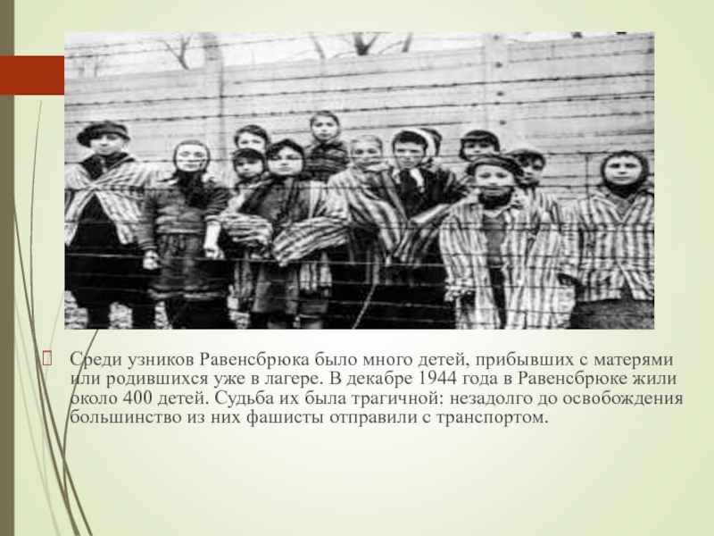 родившихся уже в лагере. В декабре 1944 года в Равенсбрюке жили около 400 детей. Судьба их была трагичной: незадолго до освобождения большинство из них фашисты отправили с транспортом.
