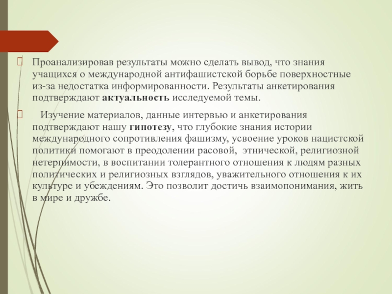 Изучение материалов, данные интервью и анкетирования подтверждают нашу гипотезу, что глубокие знания истории международного сопротивления фашизму, усвоение уроков нацистской политики помогают в преодолении расовой, этнической, религиозной нетерпимости, в воспитании толерантного отношения к людям разных политических и религиозных взглядов, уважительного отношения к их культуре и убеждениям. Это позволит достичь взаимопонимания, жить в мире и дружбе.
