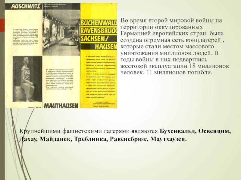 Крупнейшими фашистскими лагерями являются Бухенвальд, Освенцим, Дахау, Майданек, Треблинка, Равенсбрюк, Маутхаузен.