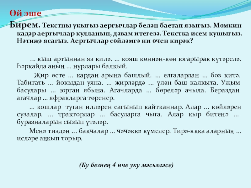 Бирем. Текстны укыгыз аергычлар белән баетап языгыз. Мөмкин кадәр аергычлар