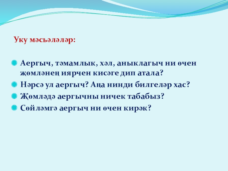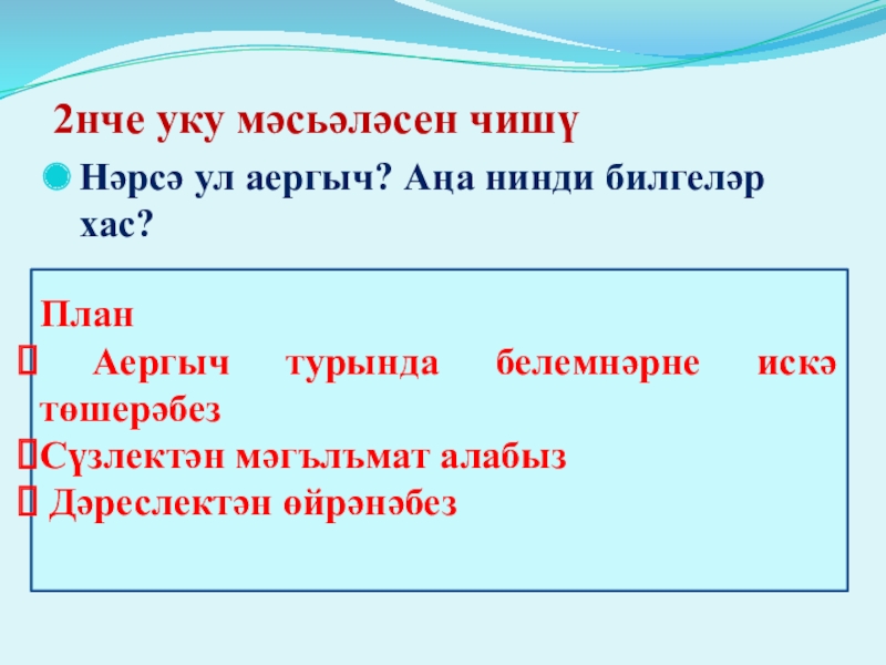 2нче уку мәсьәләсен чишүНәрсә ул аергыч? Аңа нинди билгеләр хас? План Аергыч турында белемнәрне искә төшерәбез Сүзлектән