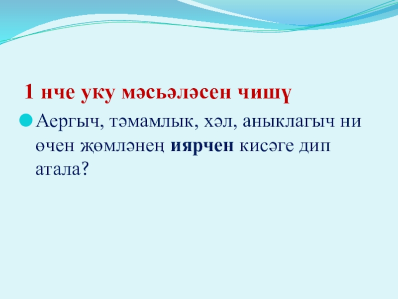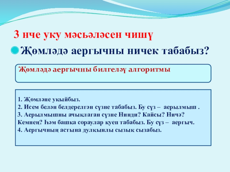 3 нче уку мәсьәләсен чишүҖөмләдә аергычны ничек табабыз?Җөмләдә аергычны билгеләү алгоритмы1. Җөмләне укыйбыз.2. Исем белән белдерелгән сүзне