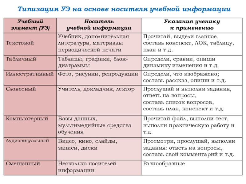 Слайд 15Типизация УЭ на основе носителя учебной информации