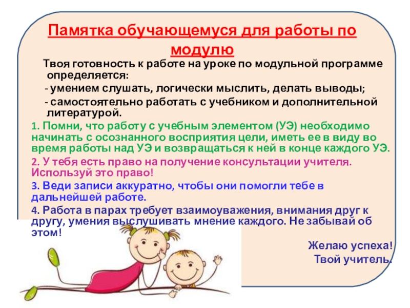 1. Помни, что работу с учебным элементом (УЭ) необходимо начинать с осознанного восприятия цели, иметь ее в виду во время работы над УЭ и возвращаться к ней в конце каждого УЭ.