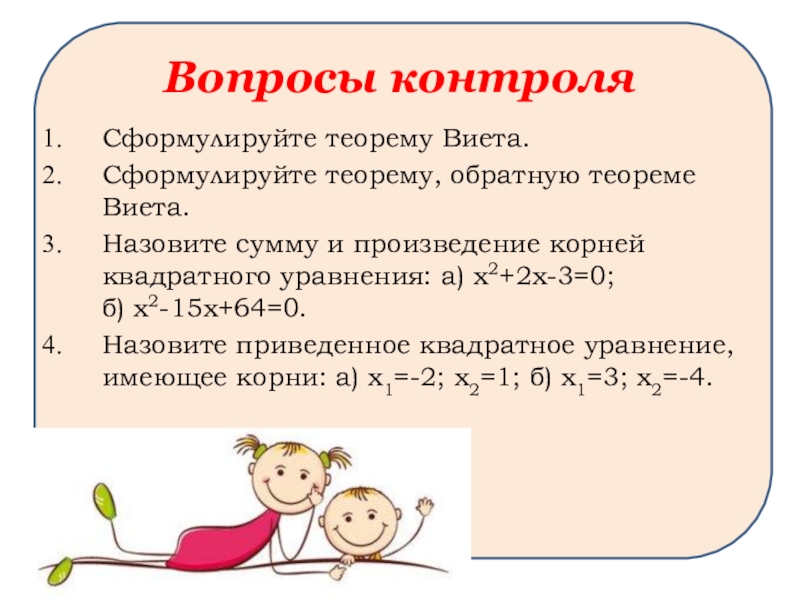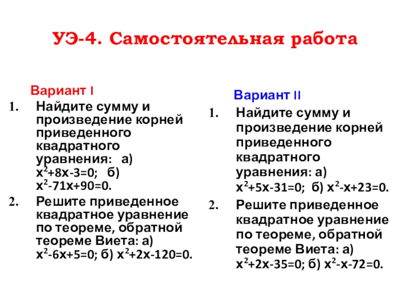 Цель: отработать теорему Виета и теорему, обратную теореме Виета