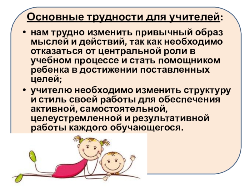 так как необходимо отказаться от центральной роли в учебном процессе и стать помощником ребенка в достижении поставленных целей;