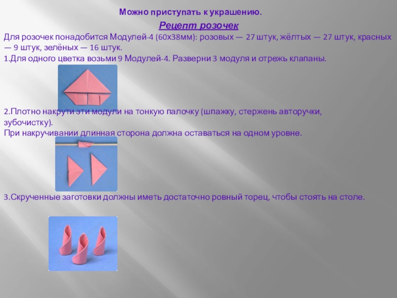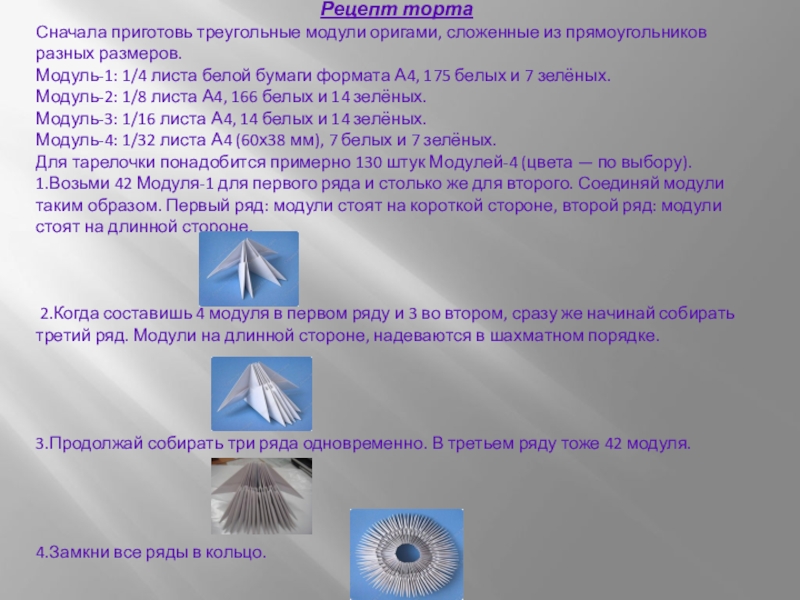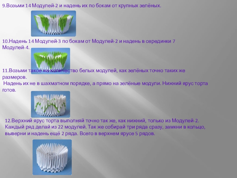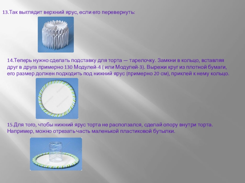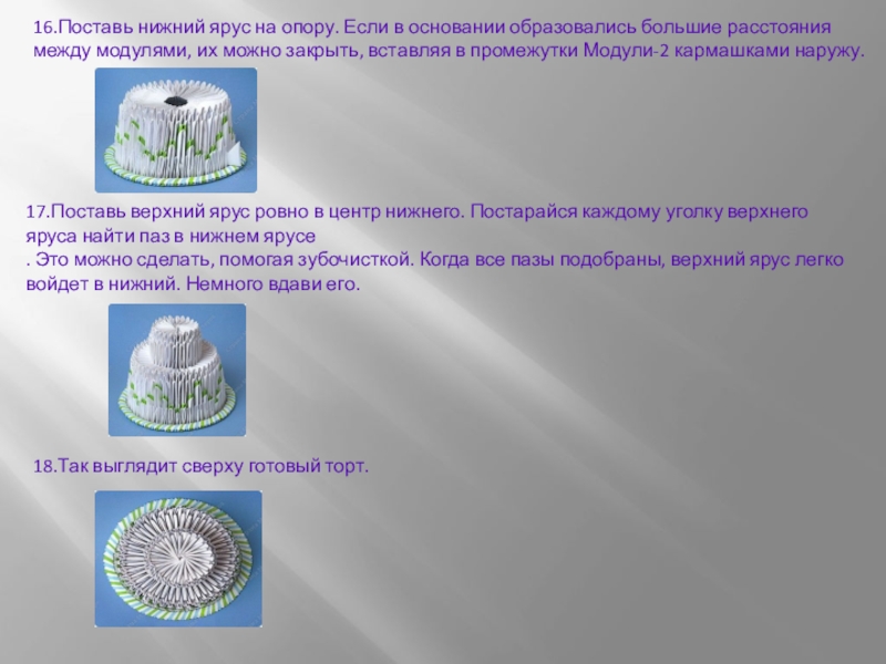 12.Верхний ярус торта выполняй точно так же, как нижний, только из Модулей-2. Каждый ряд делай из 22 модулей. Так же собирай три ряда сразу, замкни в кольцо, выверни и надень ещё 2 ряда. Всего в верхнем ярусе 5 рядов.