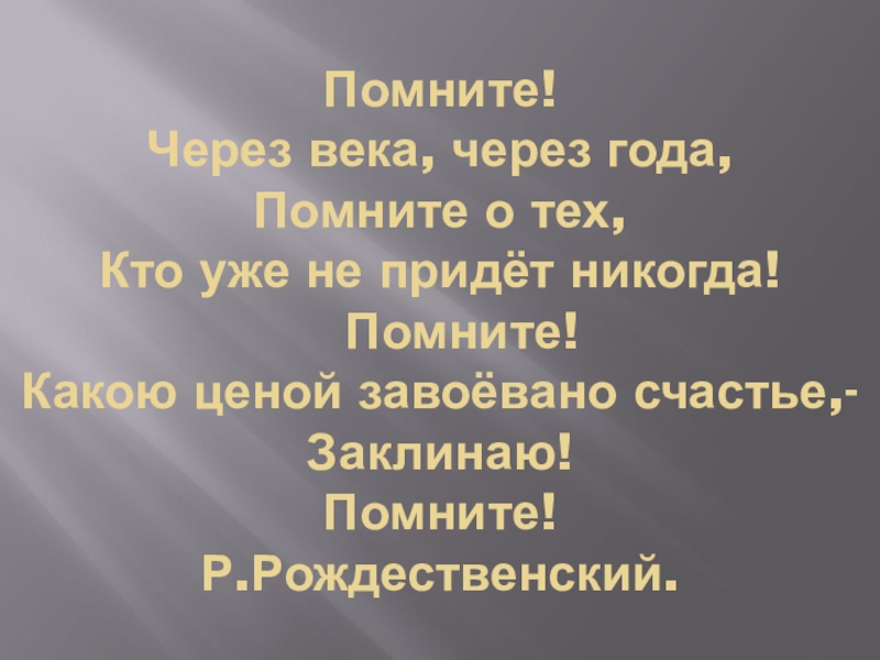 завоёвано счастье,- Заклинаю! Помните! Р.Рождественский.