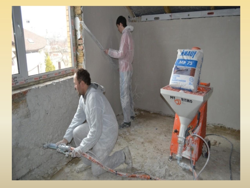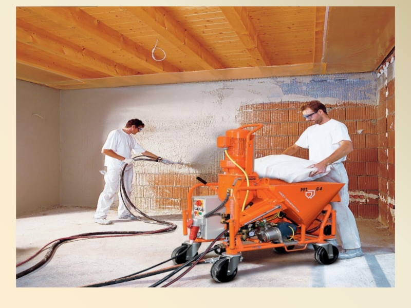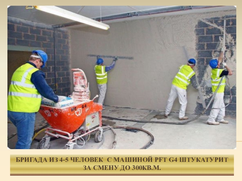 Слайд 7Бригада из 4-5 человек с машиной PFT G4 штукатурит за смену