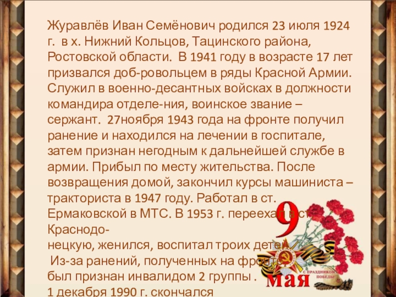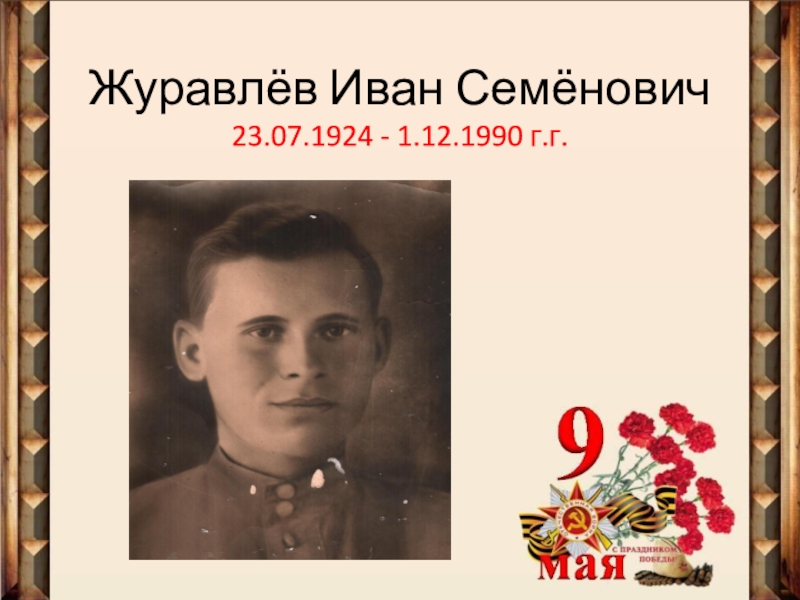 Слайд 3Журавлёв Иван Семёнович родился 23 июля 1924 г. в х. Нижний