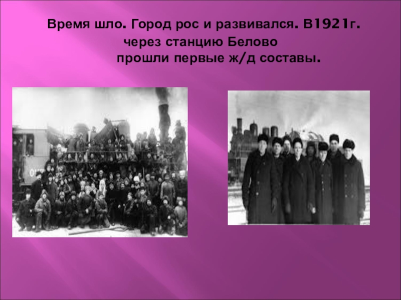 Слайд 12 Время шло. Город рос и развивался. В1921г. через станцию Белово