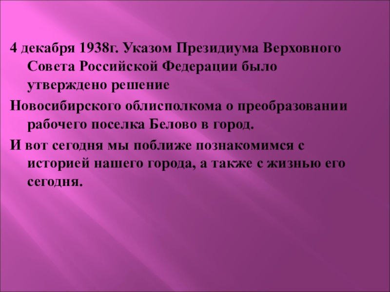 4 декабря 1938г. Указом Президиума Верховного Совета Российской Федерации было утверждено решение Новосибирского облисполкома о преобразовании рабочего