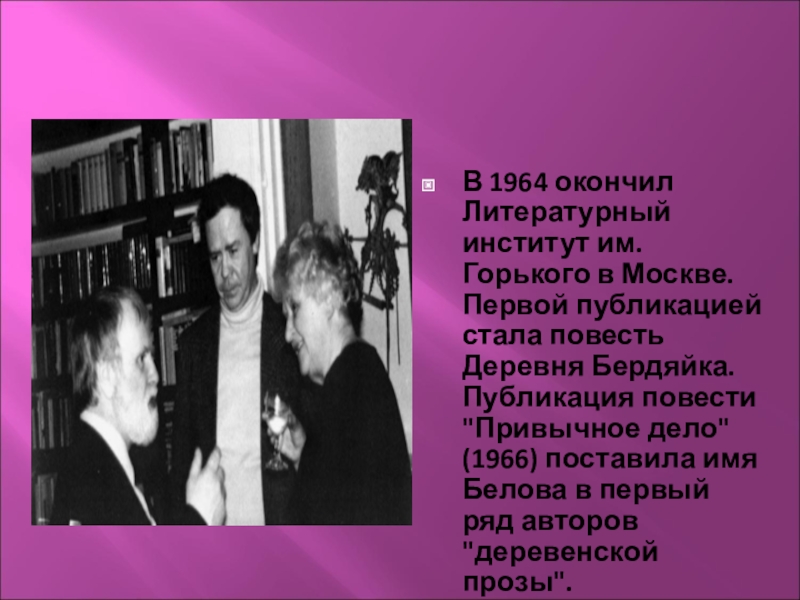 стала повесть Деревня Бердяйка. Публикация повести "Привычное дело" (1966) поставила имя Белова в первый ряд авторов "деревенской прозы".