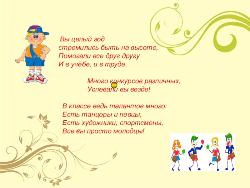 Вы целый годстремились быть на высоте,Помогали все друг другу И в учёбе, и в труде.