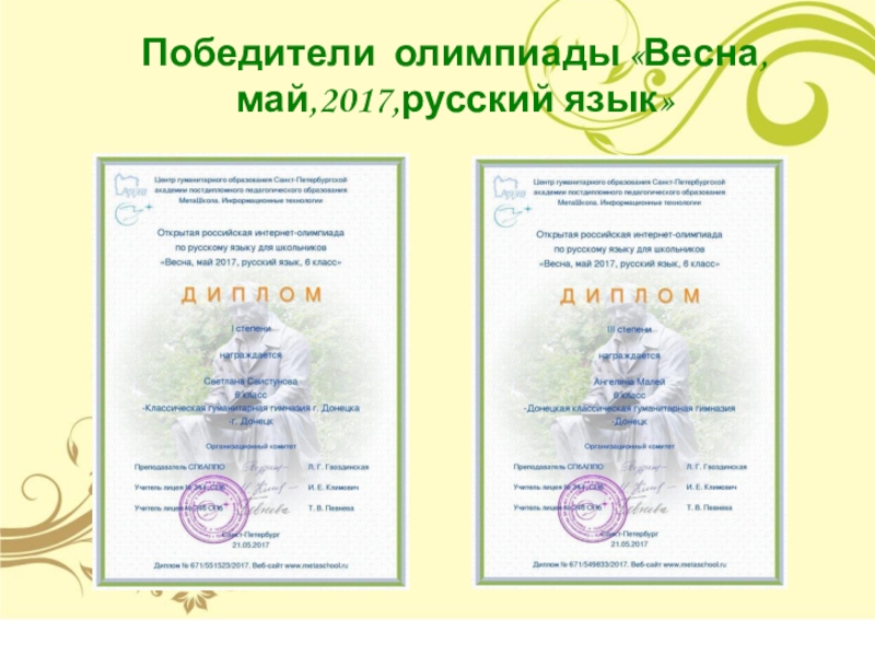 Победители олимпиады «Весна,май,2017,русский язык»
